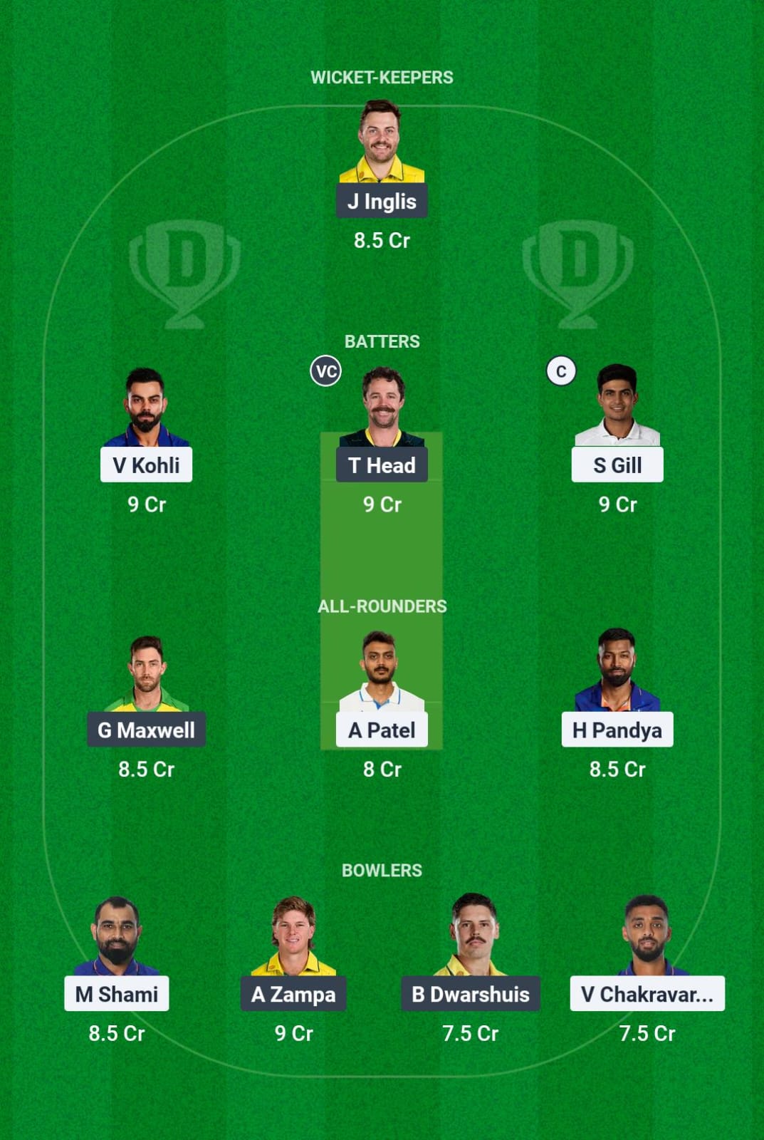 India: Rohit Sharma (c), Shubman Gill, Virat Kohli, Shreyas Iyer, Axar Patel, KL Rahul (wk), Hardik Pandya, Ravindra Jadeja, Kuldeep Yadav, Mohammed Shami, Varun Chakravarthy.