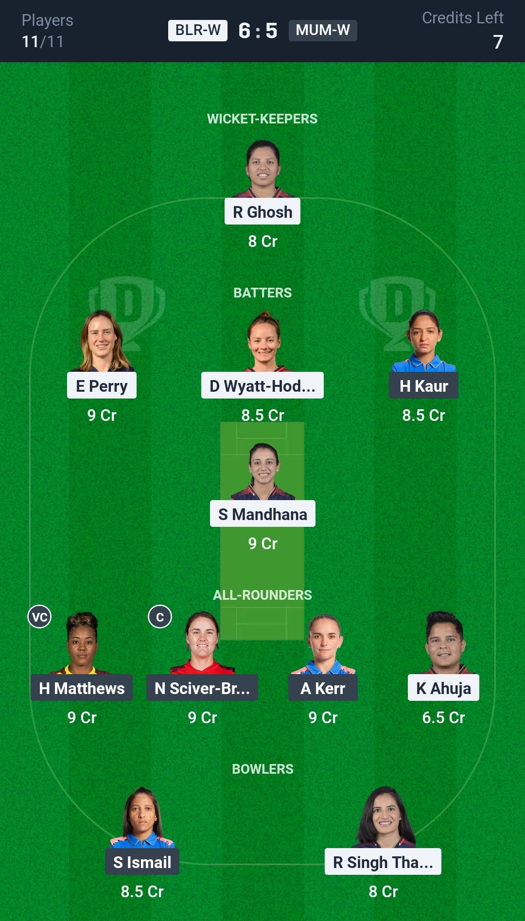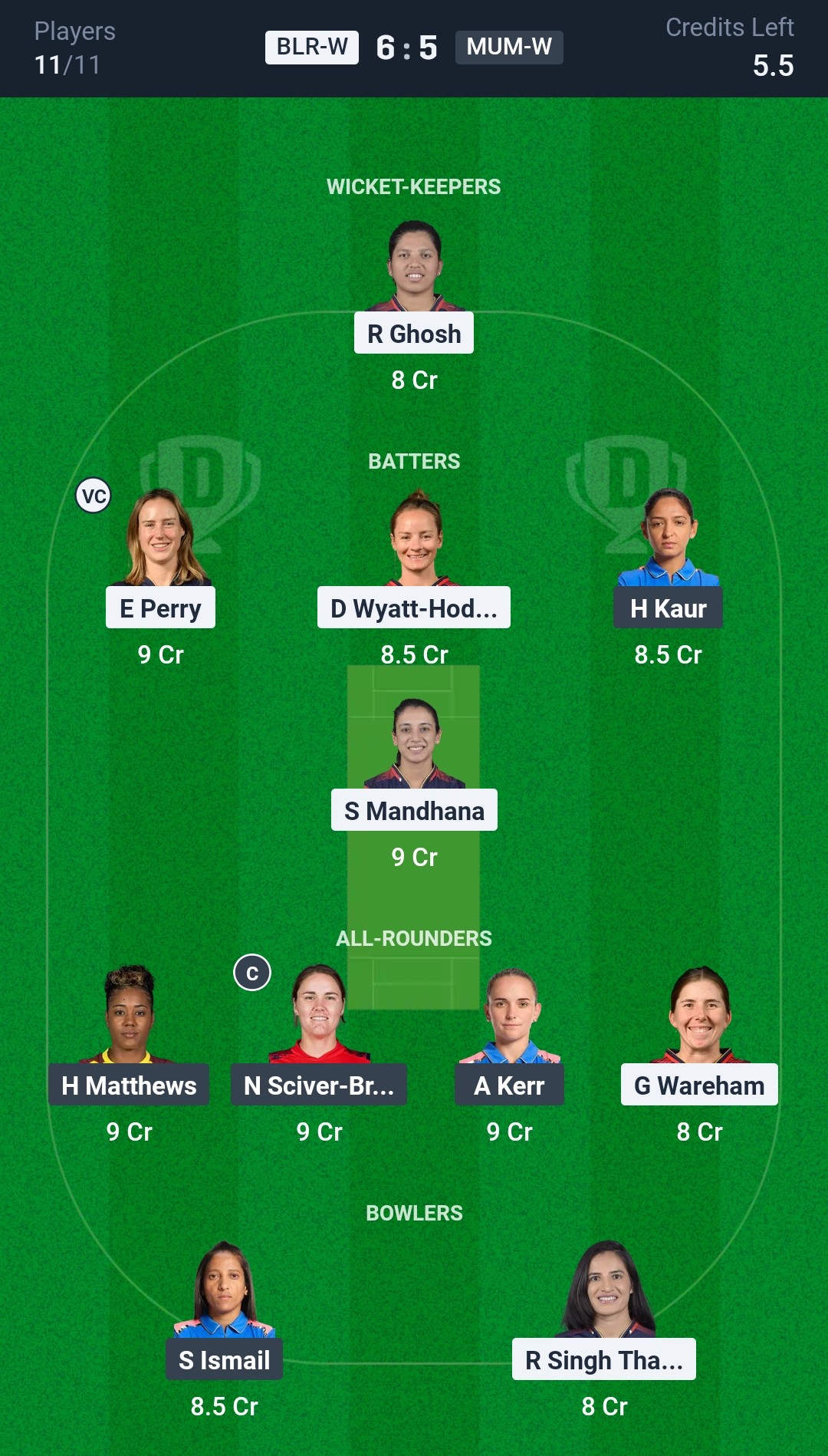 Grand League Team for BLR-W vs MUM-W Dream11 Prediction