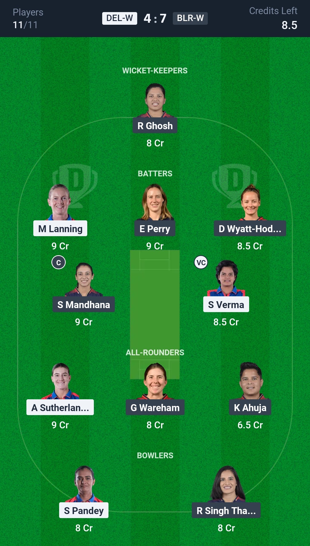 Grand League Team for DEL-W vs BLR-W Dream11 Prediction