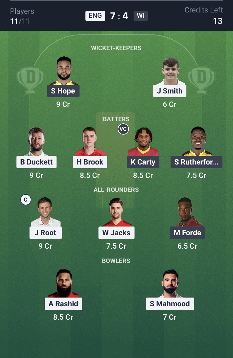 Shai Hope, Jamie Smith, Ben Duckett, Keacy Carty (vc), Harry Brook, Sherfane Rutherford, Joe Root (c), Will Jacks, Matthew Forde, Adil Rashid, Saqib Mahmood