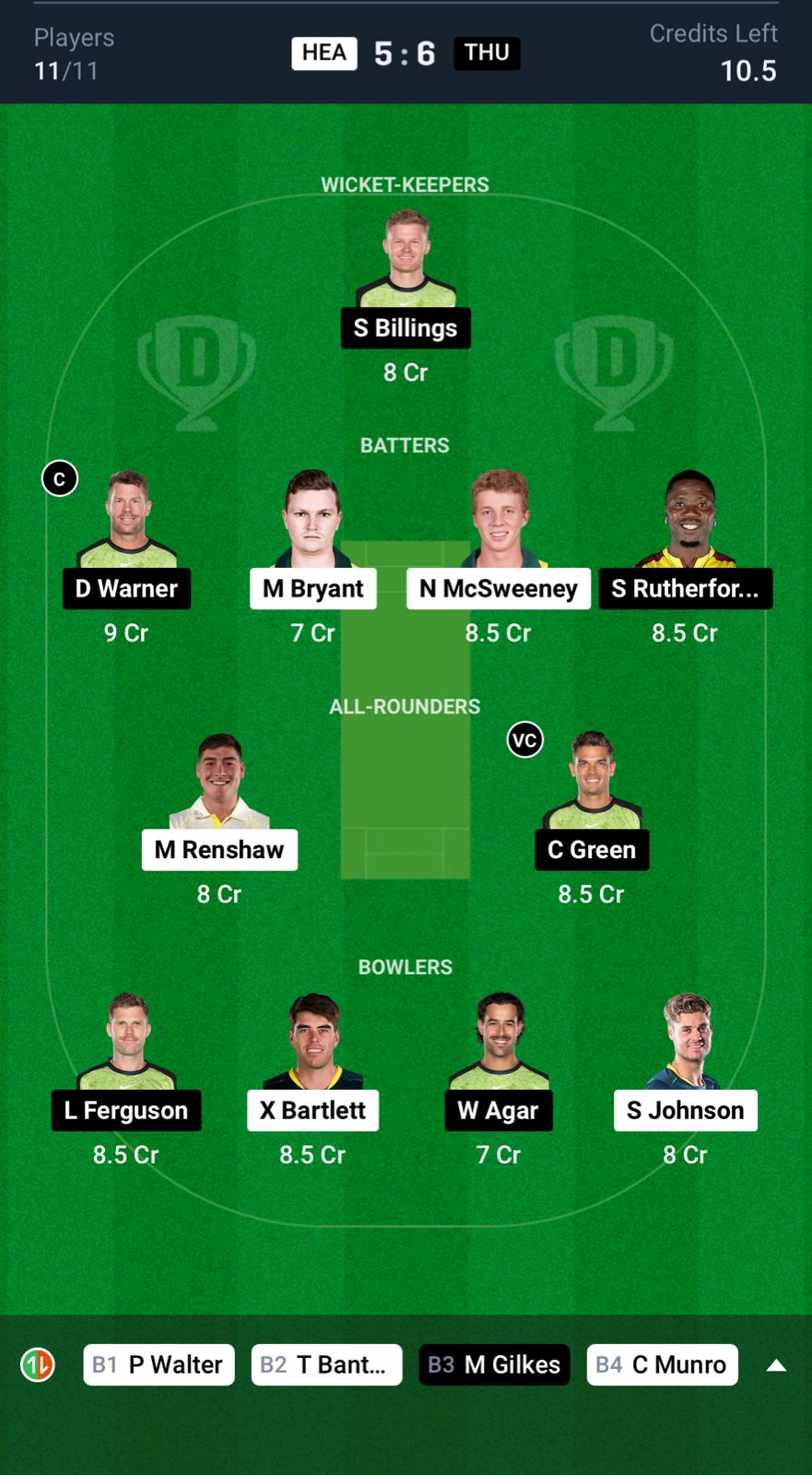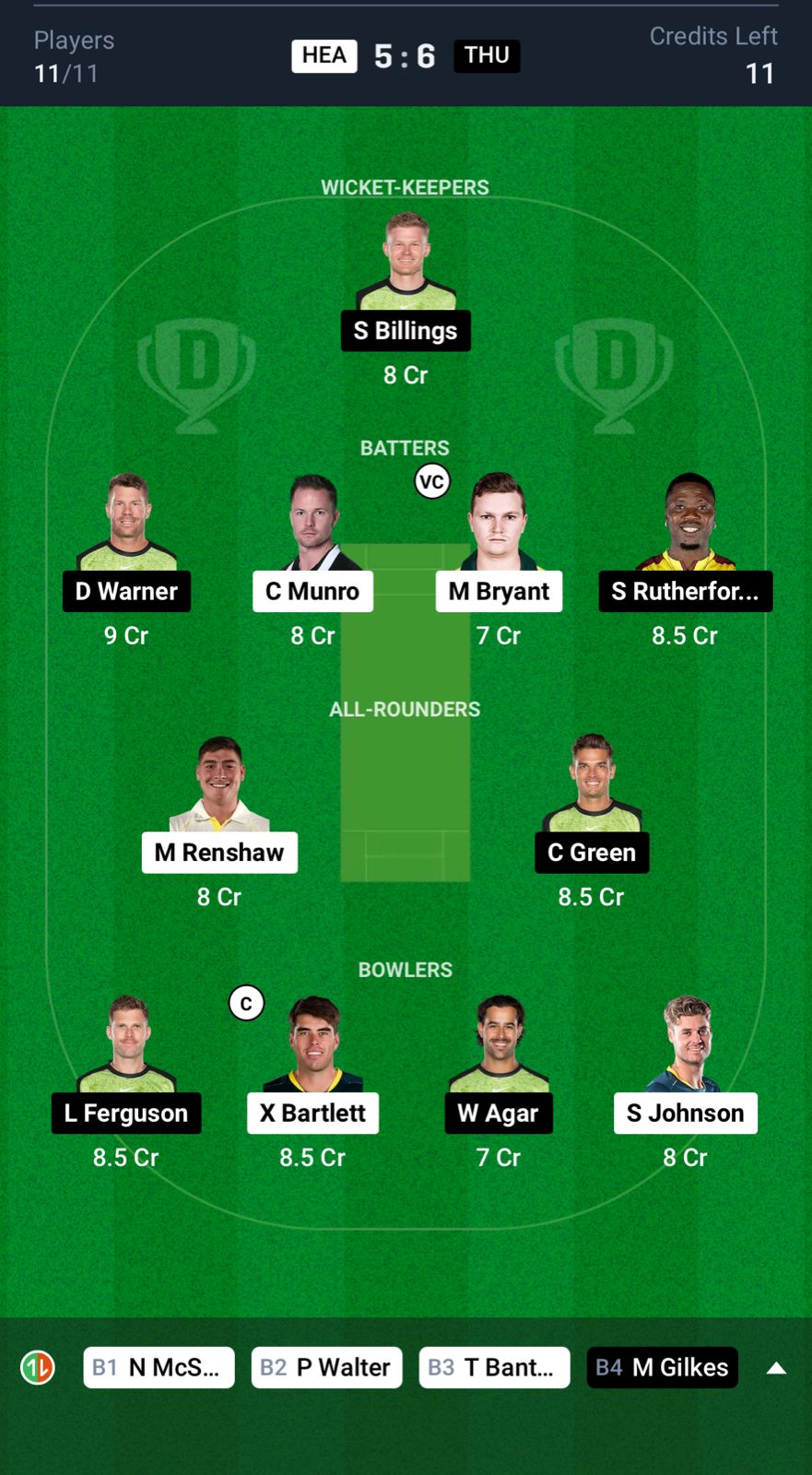 Grand League Team for HEA vs THU Dream11 Prediction
