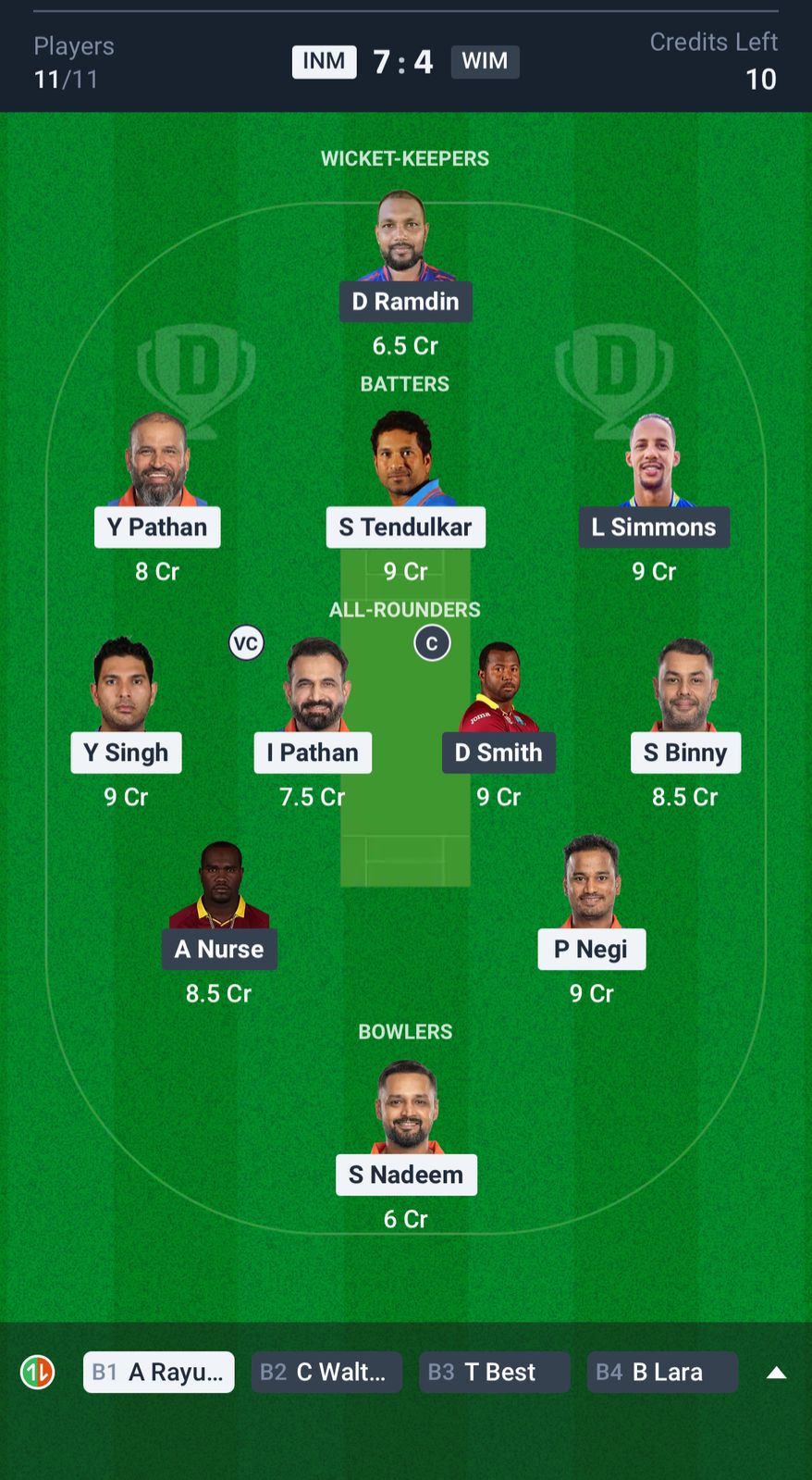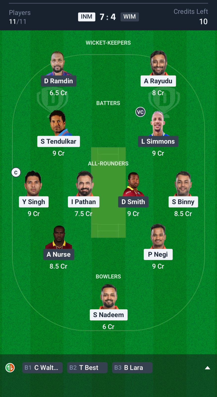 India Masters: Sachin Tendulkar (c), Ambati Rayudu (w), Gurkeerat Singh Mann, Yusuf Pathan, Yuvraj Singh, Stuart Binny, Irfan Pathan, Pawan Negi, Shahbaz Nadeem, Dhawal Kulkarni, Vinay Kumar.
