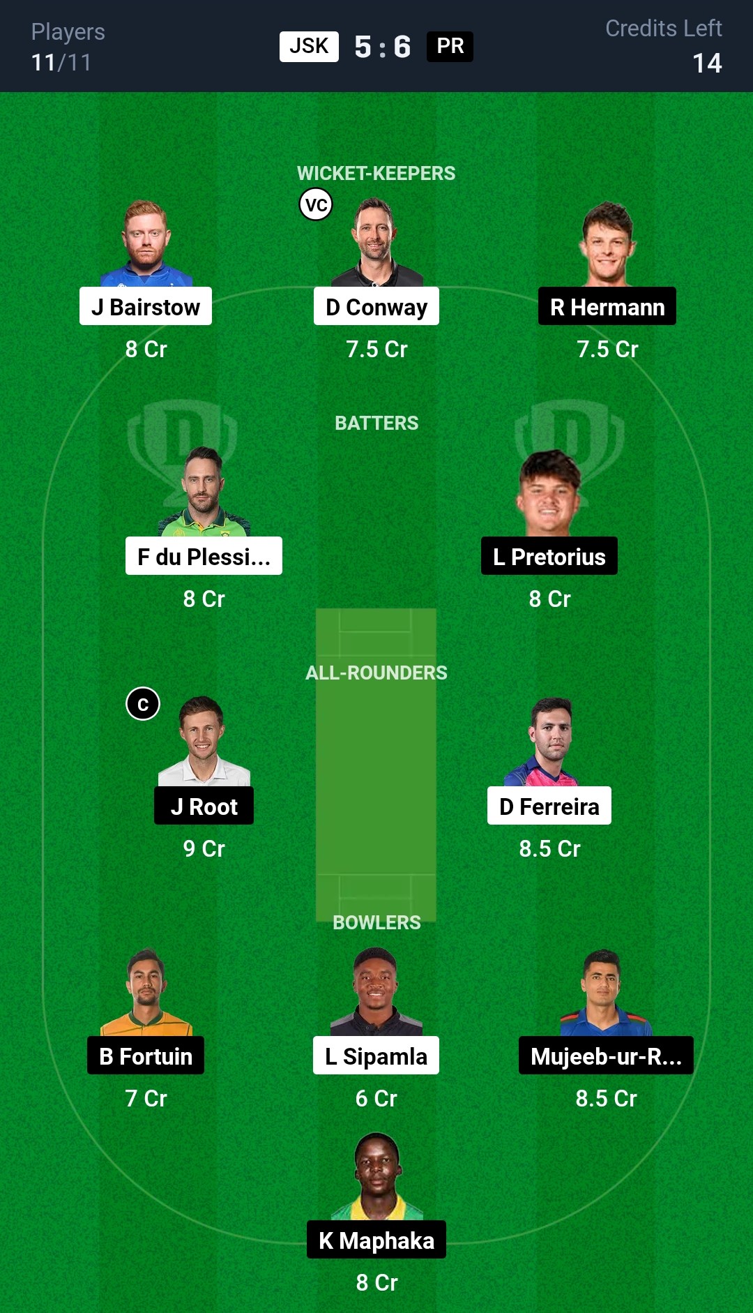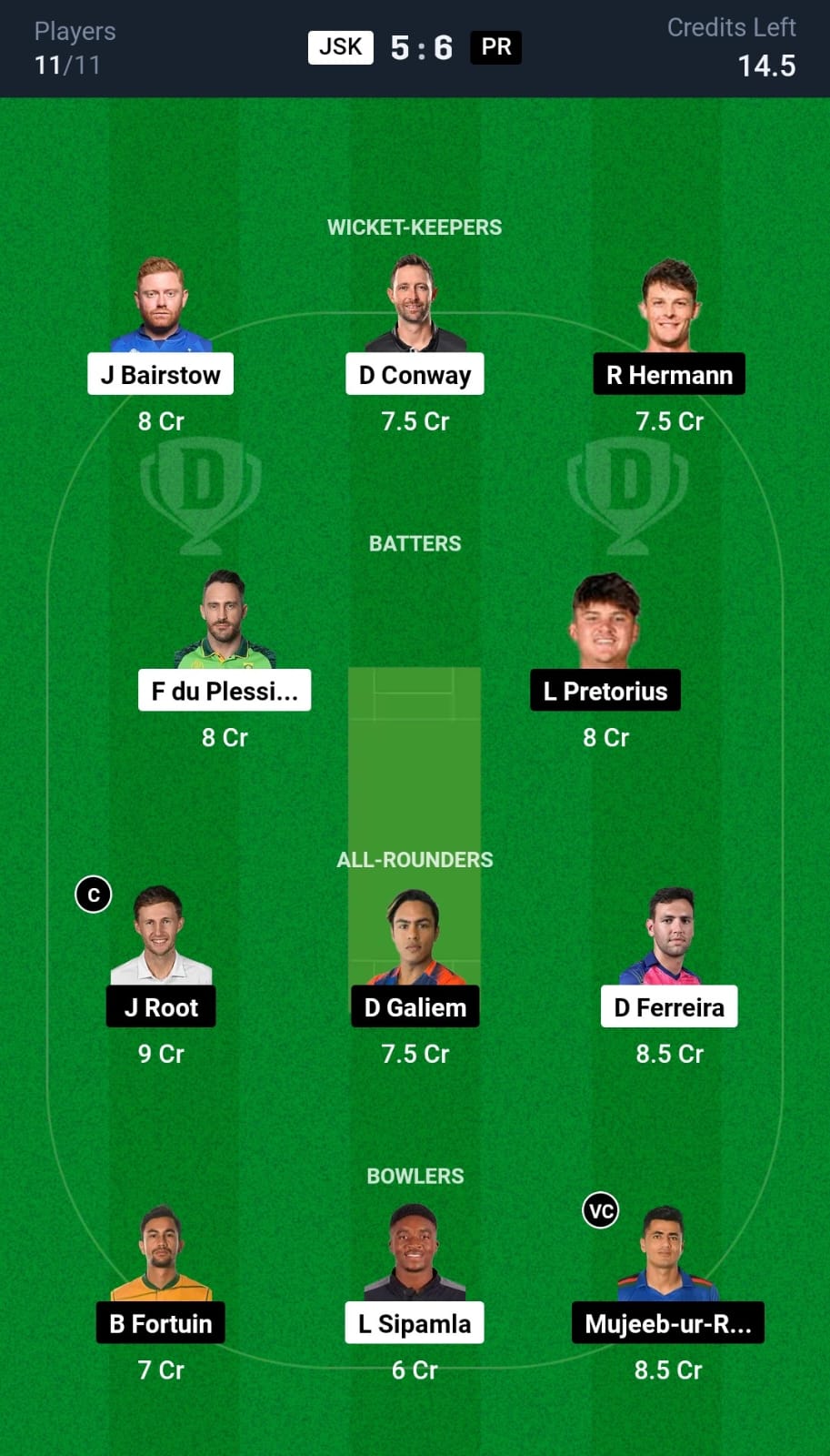 Paarl Royals: Lhuan-dre Pretorius, Joe Root, Rubin Hermann, Mitchell Van Buuren, Dewan Marais, Dinesh Karthik (wk), Dunith Wellalage, Dayyaan Galiem, Mujeeb Ur Rahman, Bjorn Fortuin, Kwena Maphaka