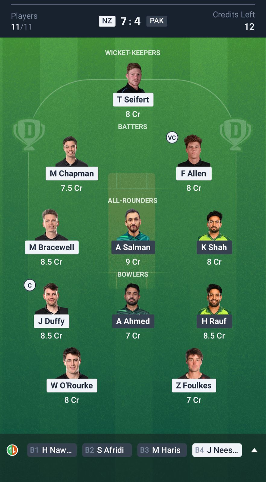 Pakistan: Tim Seifert, Finn Allen, Mark Chapman, Daryl Mitchell, James Neesham, Mitchell Hay (w), Michael Bracewell (c), Zakary Foulkes, Ish Sodhi, Jacob Duffy, William ORourke.