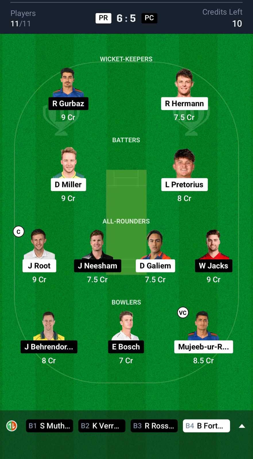 Paarl Royals: Lhuan-dre Pretorius, Joe Root, Rubin Hermann, Mitchell Van Buuren, David Miller (c), Dinesh Karthik (wk), Dayyaan Galiem, Keith Dudgeon, Bjorn Fortuin, Mujeeb Ur Rahman, Eshan Malinga