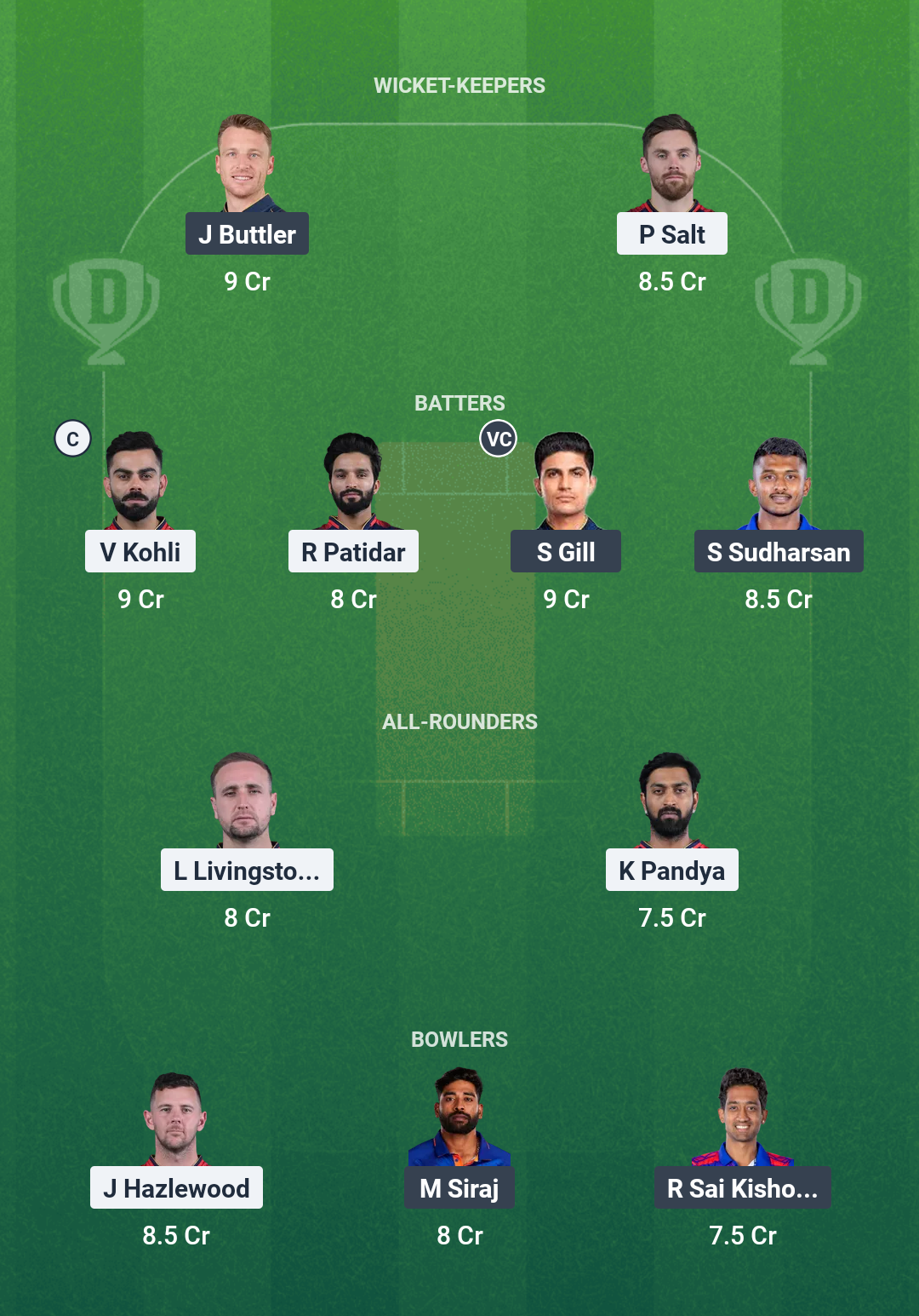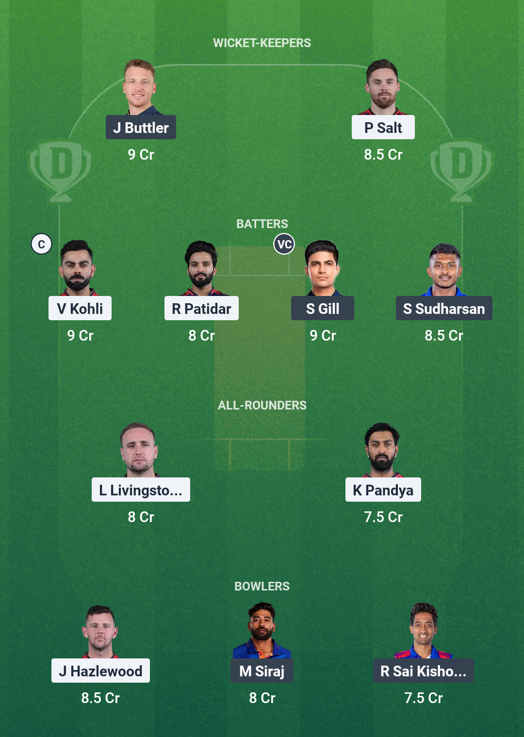 Royal Challengers Bengaluru: Phil Salt, Virat Kohli, Devdutt Padikkal, Rajat Patidar (c), Liam Livingstone, Jitesh Sharma (wk), Tim David, Krunal Pandya, Bhuvneshwar Kumar, Josh Hazlewood, Yash Dayal