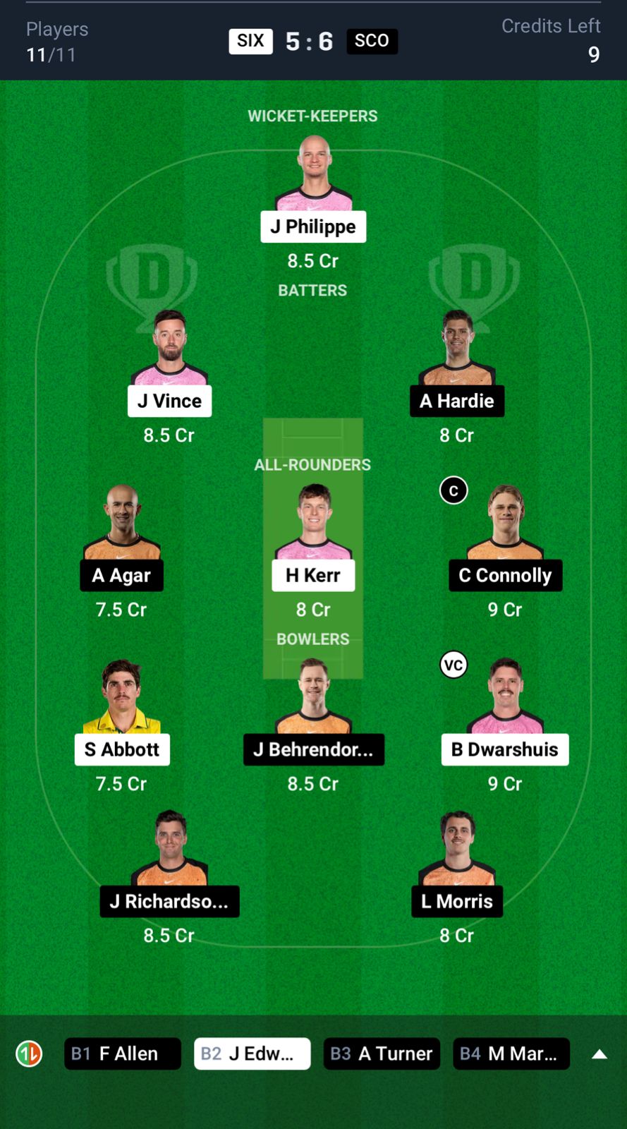 Sydney Sixers: Josh Philippe (wk), James Vince, Kurtis Patterson, Moises Henriques (c), Jordan Silk, Jack Edwards, Hayden Kerr, Ben Dwarshuis, Sean Abbott, Akeal Hosein, Todd Murphy