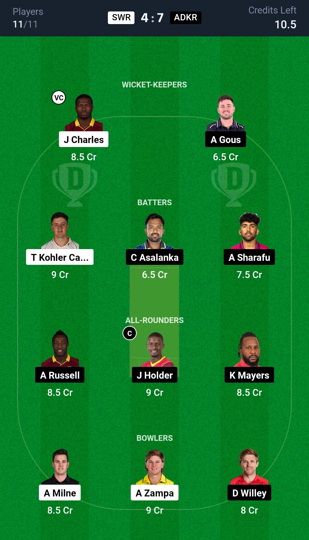 Sharjah Warriorz: Tom Kohler-Cadmore (wk), Johnson Charles, Avishka Fernando, Rohan Mustafa, Jason Roy, Tim Seifert, Ashton Agar, Ethan D’Souza, Adam Milne, Tim Southee (c), Dilshan Madushanka, Adam Zampa