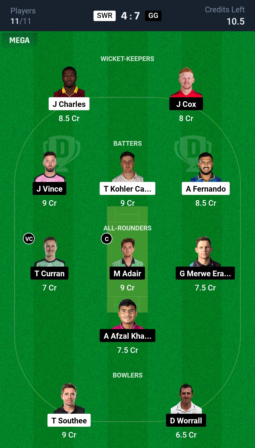 Gulf Giants: James Vince (c), Tom Alsop, Jordan Cox (wk), Gerhard Erasmus, Shimron Hetmyer, Ibrahim Zadran, Tom Curran, Mark Adair, Aayan Khan, Daniel Worrall, Muhammad Zuhaib, Blessing Muzarabani