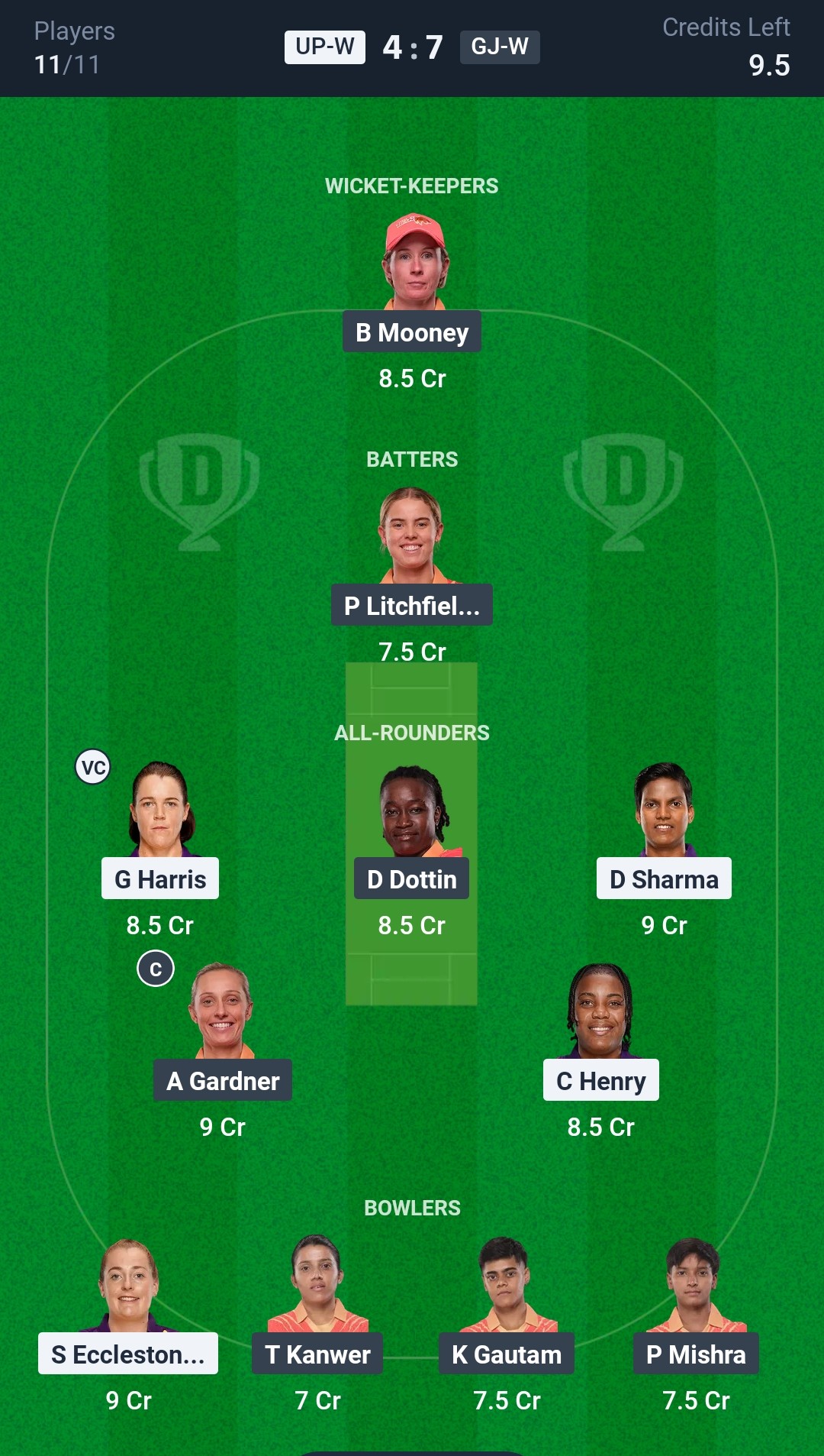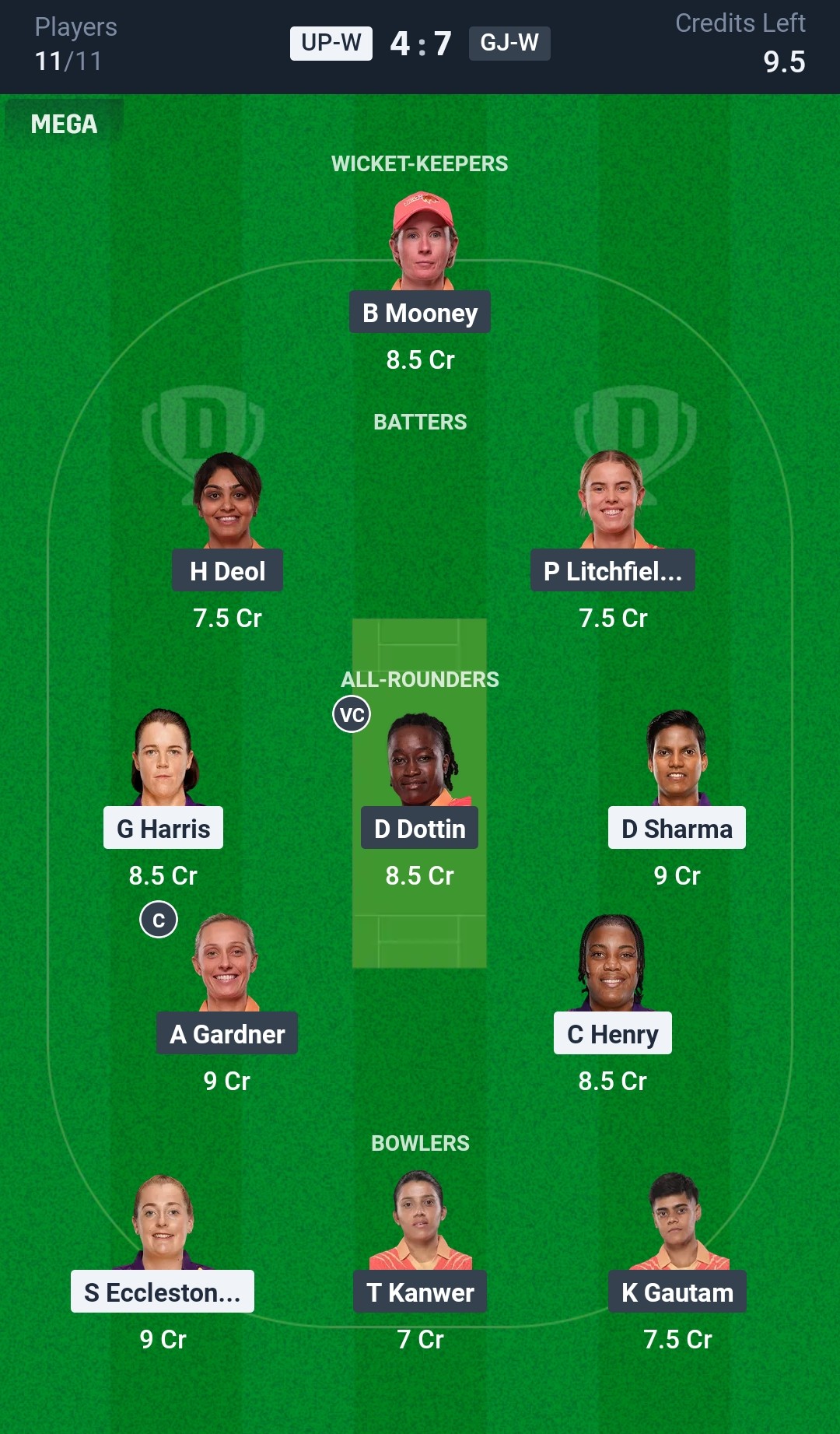 Gujarat Giants Women: Beth Mooney (wk), Dayalan Hemalatha, Harleen Deol, Phoebe Litchfield, Ashleigh Gardner (c), Deandra Dottin, Bharti Fulmali, Kashvee Gautam, Priya Mishra, Tanuja Kanwar, Meghna Singh .