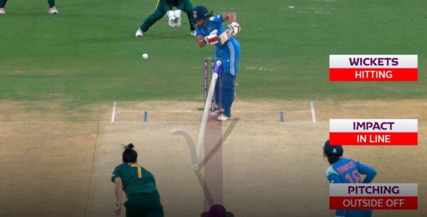 The incident happened on the penultimate ball of the fifth over by Marizanne Kapp. The Proteas bowled a back-of-a-length delivery and it jagged back sharply. Rawal was caught on the crease and it struck her on the back leg. South Africa players went up in an appeal but it was turned down, presumably with height looking like an issue and it may have gone down leg.