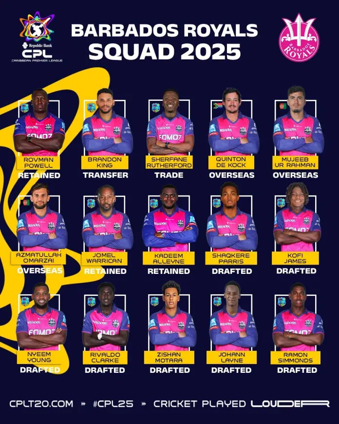 Barbados Royals: Rovman Powell, Brandon King, Sherfane Rutherford, Quinton de Kock, Mujeeb Ur Rahman, Azmatullah Omarzai, Jomel Warrican, Kadeem Alleyne, Shaqkere Parris, Kofi James, Nyeem Young, Rivaldo Clarke, Zishan Motara, Johann Layne, Ramon Simmonds