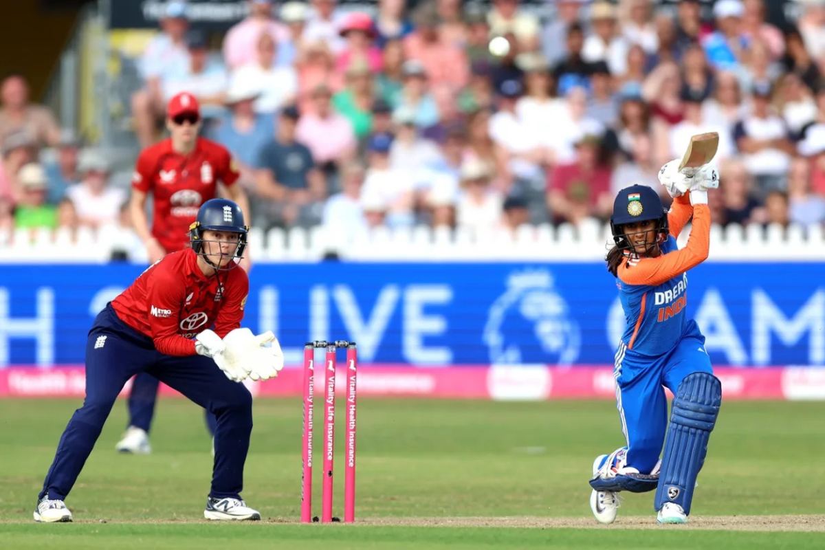 At the time of writing this report, Jemimah Rodrigues was batting on 59 runs from 36 balls. She was later dismissed for 63 runs from 41 balls, hitting nine fours and one six. Her previous highest T20I score against England was an unbeaten 44 that she made during the semi-final of the 2022 Commonwealth Games in Birmingham.